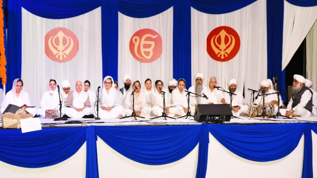 In preparation for the forecasted weather, organizers had moved the entire program indoors. Babaji’s hall was arranged with care and reverence, and a red carpet welcomed the Sangat into the venue. Along the walkway, artwork and cutouts depicting the Chaar Sahibzaade greeted attendees as they made their way inside.