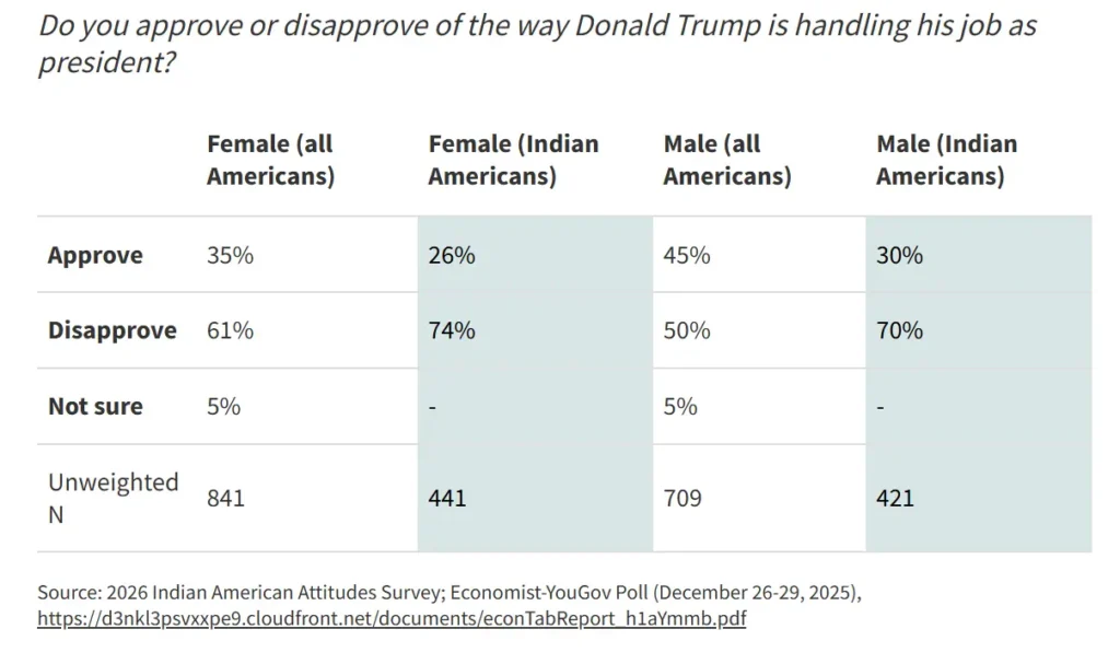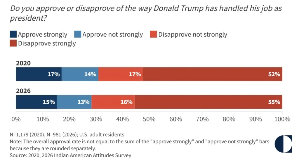 The survey of 1,000 Indian American adults conducted between late 2025 and early 2026 indicates a largely critical view of the administration’s performance: