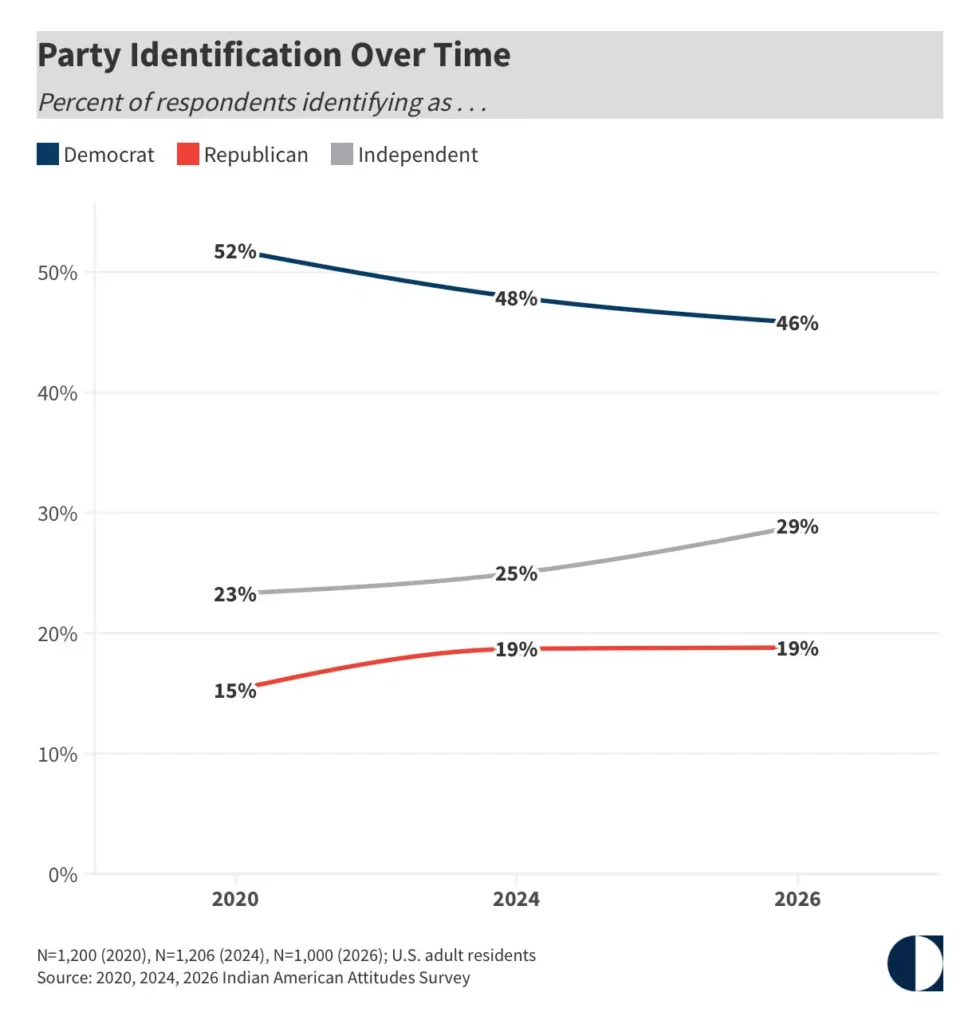 But Democratic gains have stalled. In a hypothetical rerun of the 2024 presidential election, Democratic support remains about ten percentage points below its 2020 high watermark. Party identification has shifted as well. The share of Indian Americans identifying as Democrats has declined from 52 percent in 2020 to 46 percent in 2026, while nearly one third now identify as independents. Ratings of the Democratic Party have cooled, falling from 75 out of 100 in 2020 to 69 in 2026 on a feeling thermometer scale.