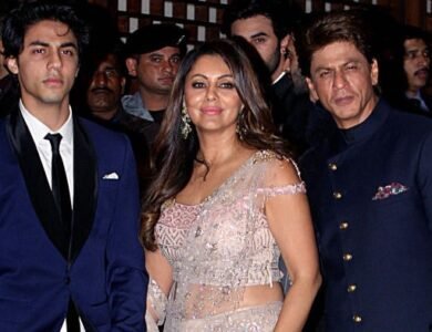 Indian Bollywood actor Shah Rukh Khan (right) poses for a picture with his wife Gauri Khan and son Aryan Khan as they attend the pre-engagement party of India's richest man and Reliance Industries Limited Chairman, Mukesh Ambanis eldest son Akash