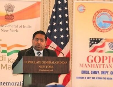 Consul General of India in New York Randhir Kumar Jaiswal addresses a meet and greet event for Indian students Sept. 17. GOPIO-Manhattan, whose chairman is Indian American Thomas Abraham, organized the event in cooperation with the Consulate General of India