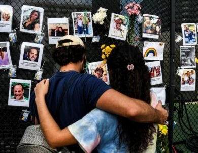 People visit the makeshift memorial for the victims of the building collapse, near the site of the accident in Surfside, Florida, north of Miami Beach on June 27, 2021. More than 150 people are still missing and their weary families