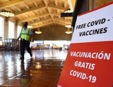 A sign advertises a free vaccination site set up inside Union Station in an effort to target commuters, on June 10, 2021 in Los Angeles, California. Indian American U.S. Representatives Raja Krishnamoorthi and Pramila Jayapal were among lawmakers introducing the