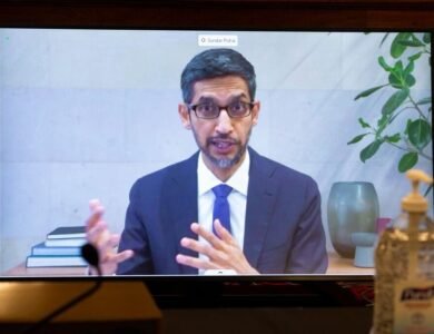 File photo of Sundar Pichai, the Indian American CEO of Alphabet Inc. and its subsidiary Google LLC, appearing on a monitor as he testifies remotely during the Senate Commerce, Science, and Transportation Committee hearing 'Does Section 230's Sweeping Immunity Enable