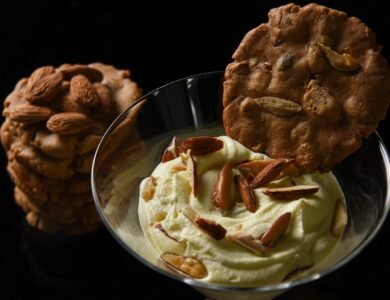 Ingredients For badam milk mousse . Almond flakes 45 gms . Almond milk 150 ml . White chocolate 425 gm . Bakery cream 400 ml . Egg yolk 5 no . Fine sugar 50 gm . Saffron 1/2 gm . Green cardamom powder tsp For biscotti . Unsalted butter 75 gms . Castor