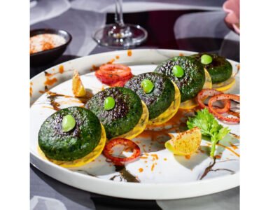 Ingredients: Edamame 150 gm Hung curd 50 gm Spinach 200 gm Mace powder 10 gm Black pepper 5 gm Green cardamom 20 gm Gram flour 100 gm Salt 20 gm Chaat masala 30 gm Cumin powder 20 gm Almonds 30 gm Coriander leaves 40 gm Green chili 20 gm Methi mayonnaise 2 tsp Ghee 10