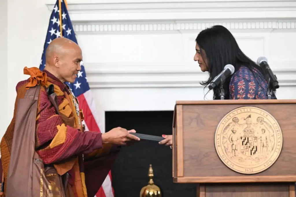 Anne Arundel County Executive Steuart Pittman and Miller jointly issued a proclamation declaring February 12, 2026, as “Walk for Peace Day.” Montgomery County faith liaison Kate Chance presented a citation marking the occasion, while Capitol Police Lieutenant Colonel Glend McGuire honored the monks with a police badge.