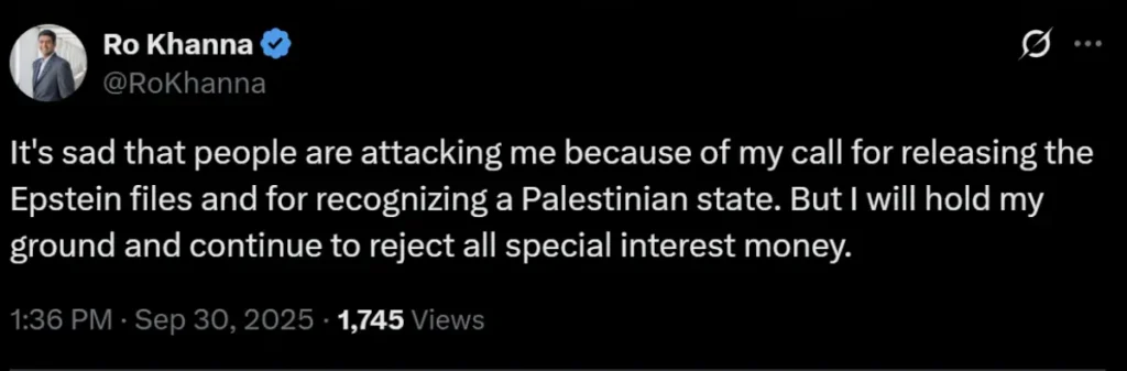 He later suggested the attacks were politically motivated, tied to his outspoken positions on Epstein and foreign policy. “People are attacking me because I called for the Epstein files to be released and for Palestine to be recognized as a state. But I will hold my ground and continue to reject all special interest money,” he posted.